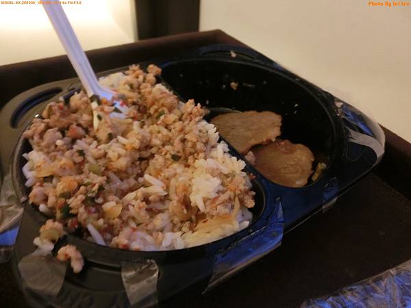 上圖是烤豬肉兩塊及辣肉末飯 右圖為攪拌過後的照片
